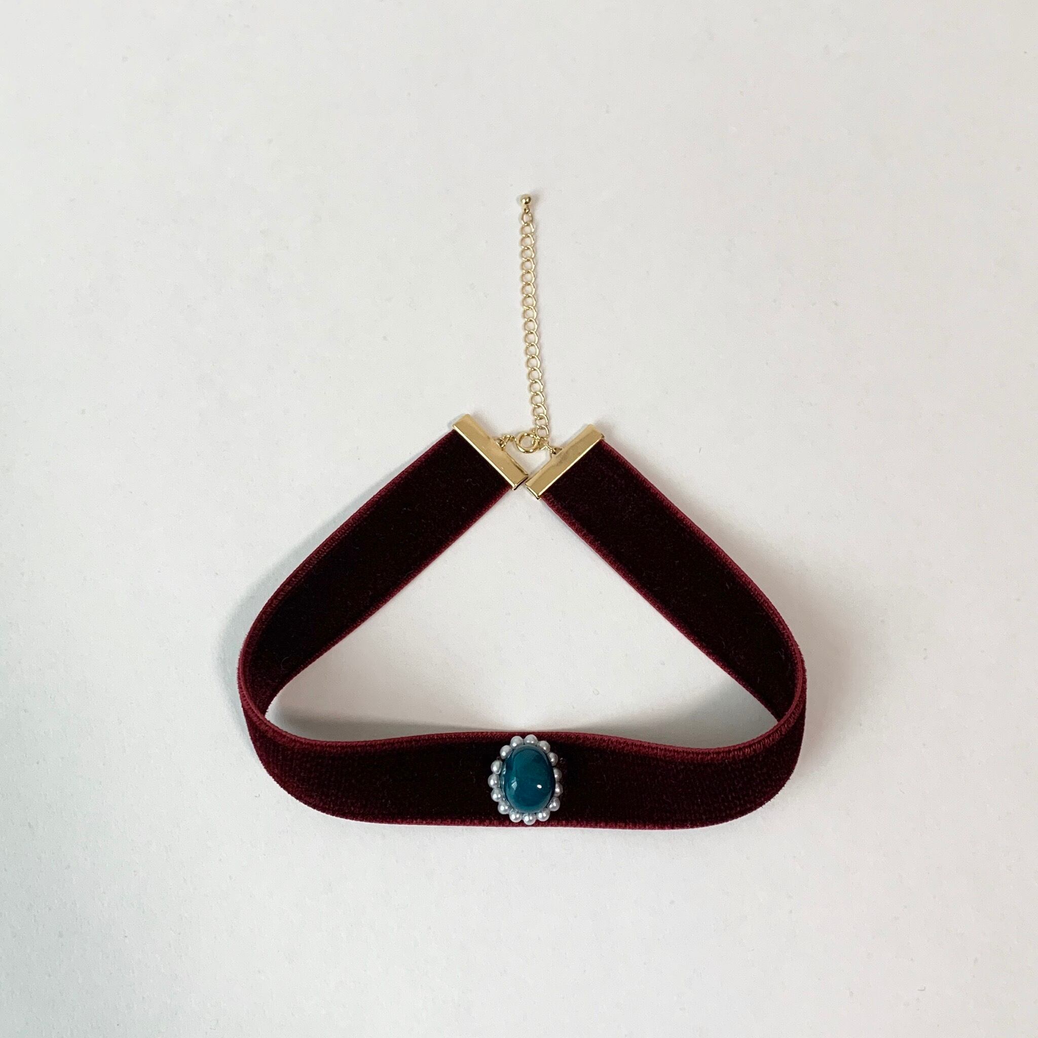 ボルドーのベルベットリボンにピーコックブルーの石とパールがついたチョーカーです。