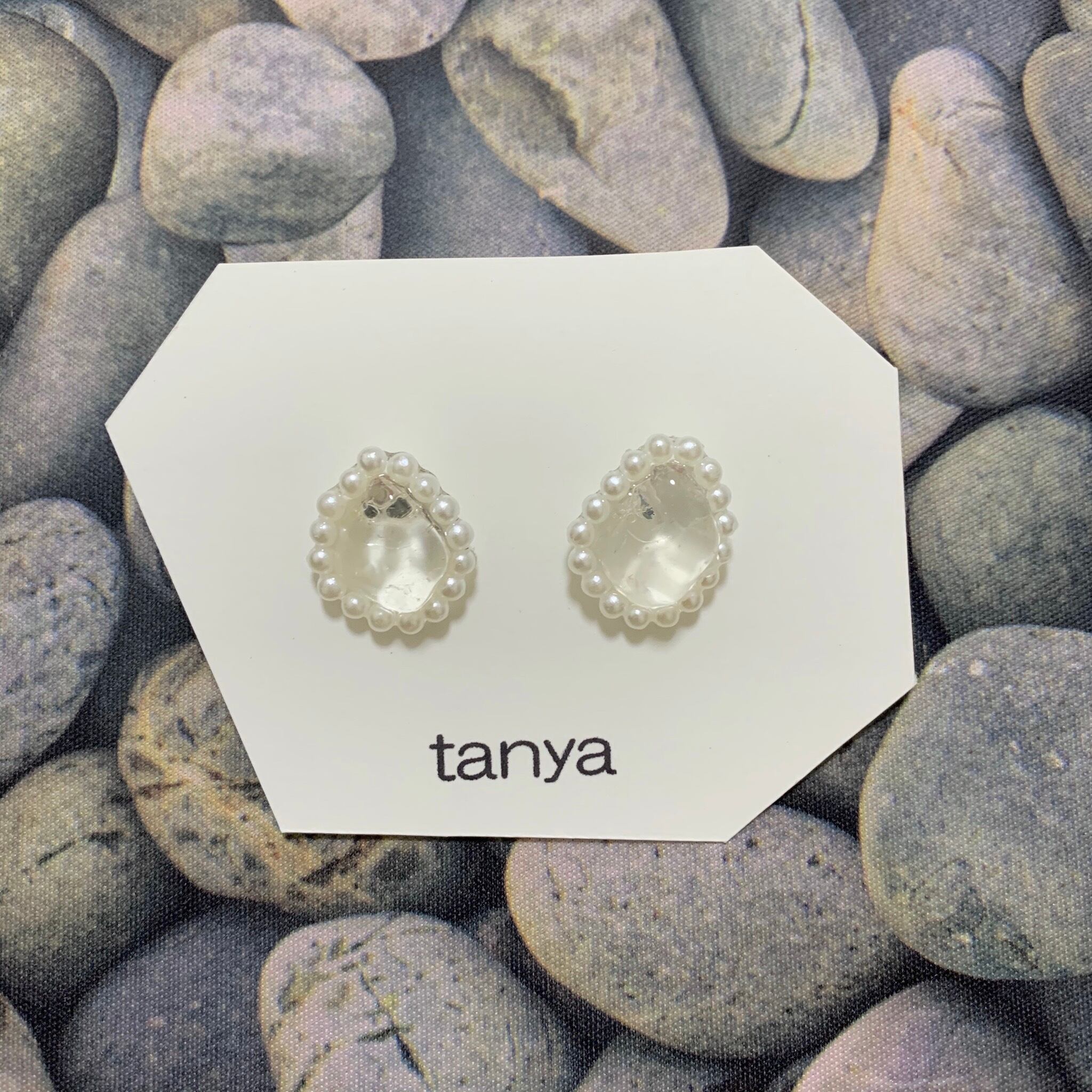 透明の似ている石が2つあったので作った幻の石のピアスです。パールを含めた石のサイズは縦の直径が2cmほど。