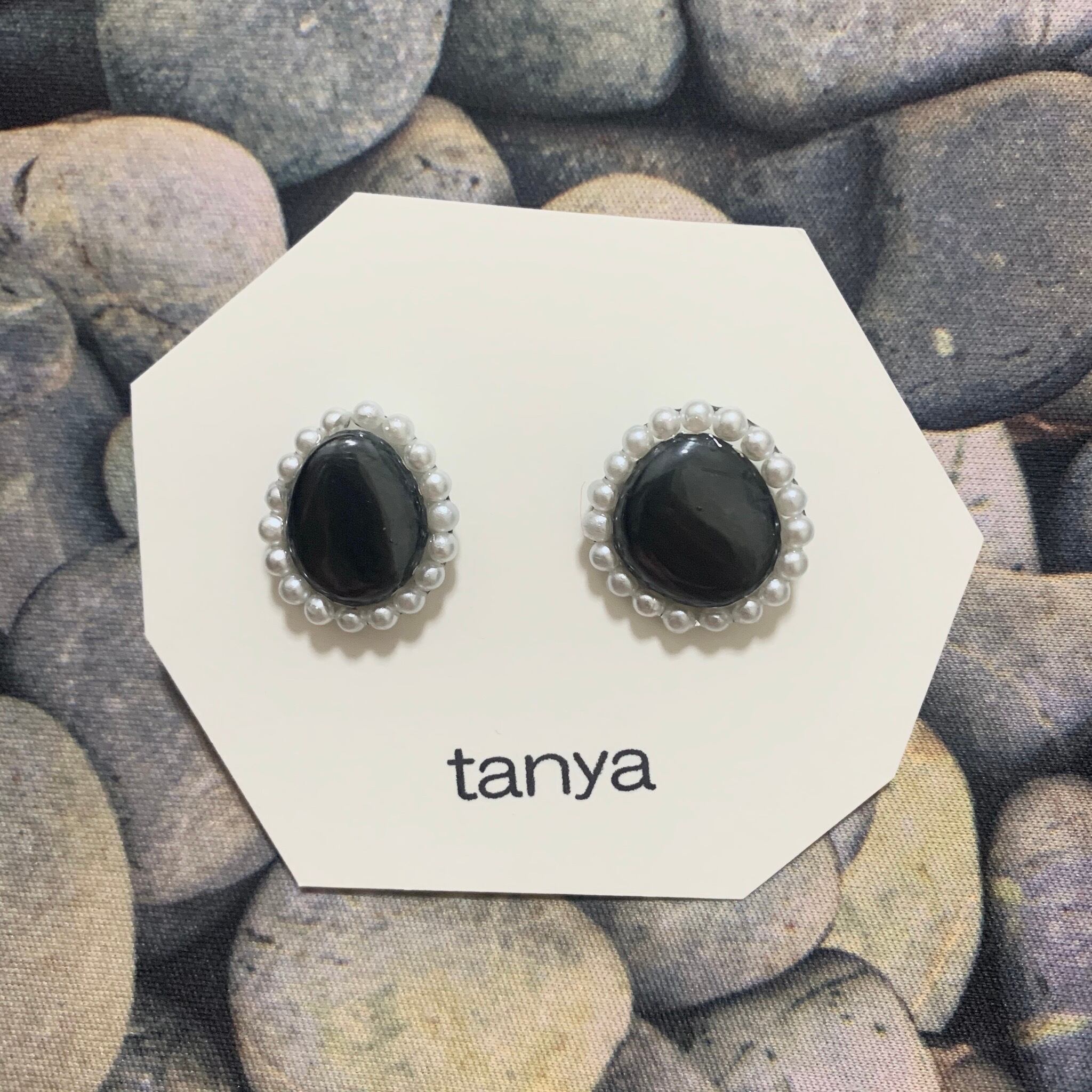黒の似ている石が2つあったので作った幻の石のピアスです。パールを含めた石のサイズは縦の直径が2cmほど。