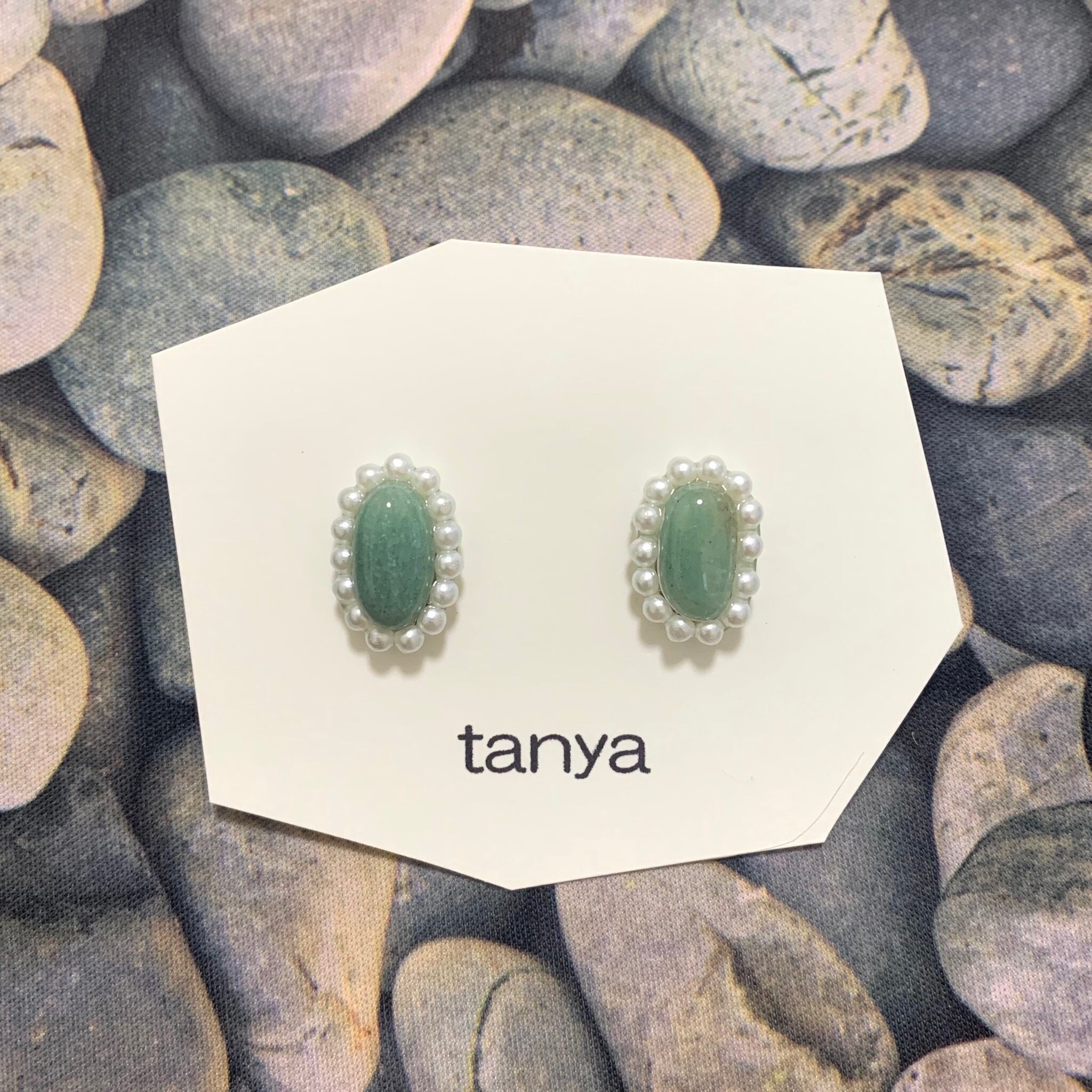 緑の似ている石が2つ揃ったので作った幻の石のイヤリング。パールを含めた石のサイズは縦の直径が約1.8cmです。
