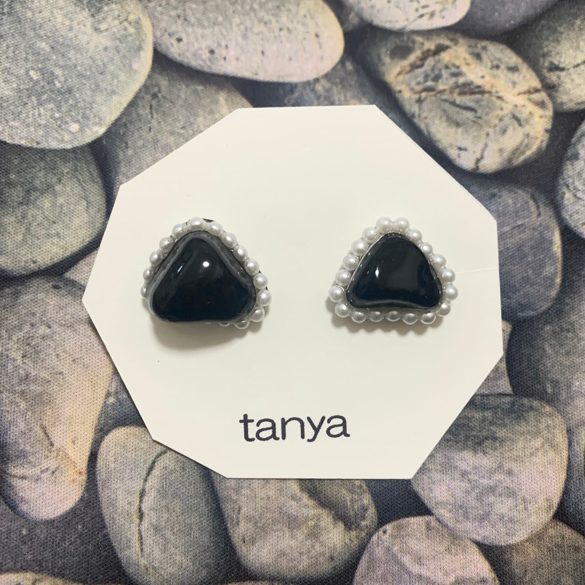黒の似ている三角の石が2つ揃ったので作った幻の石のイヤリング。パールを含めた石のサイズは縦の直径が約1.7cm。金具はゴールドです。