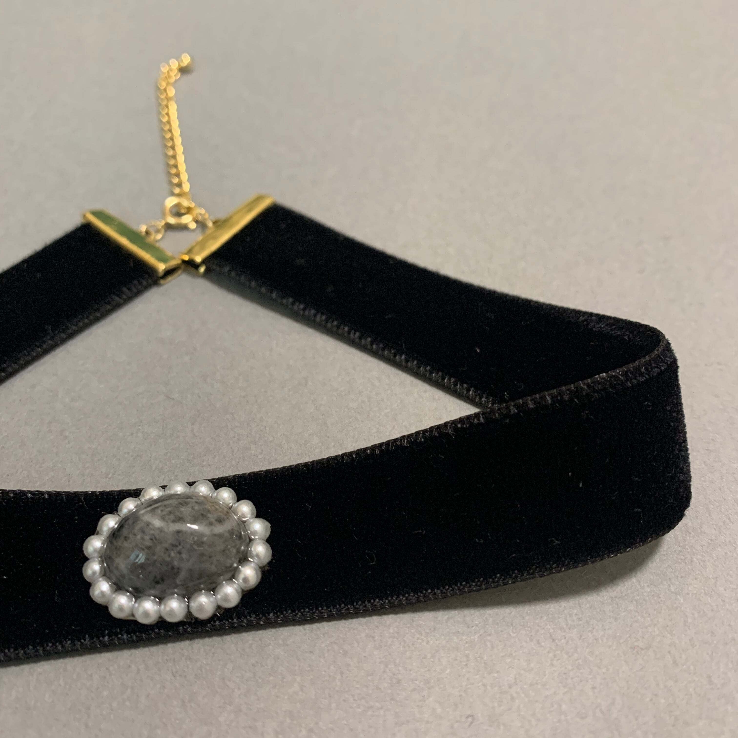 黒いベルベットリボンに石とパールがついたチョーカーです。