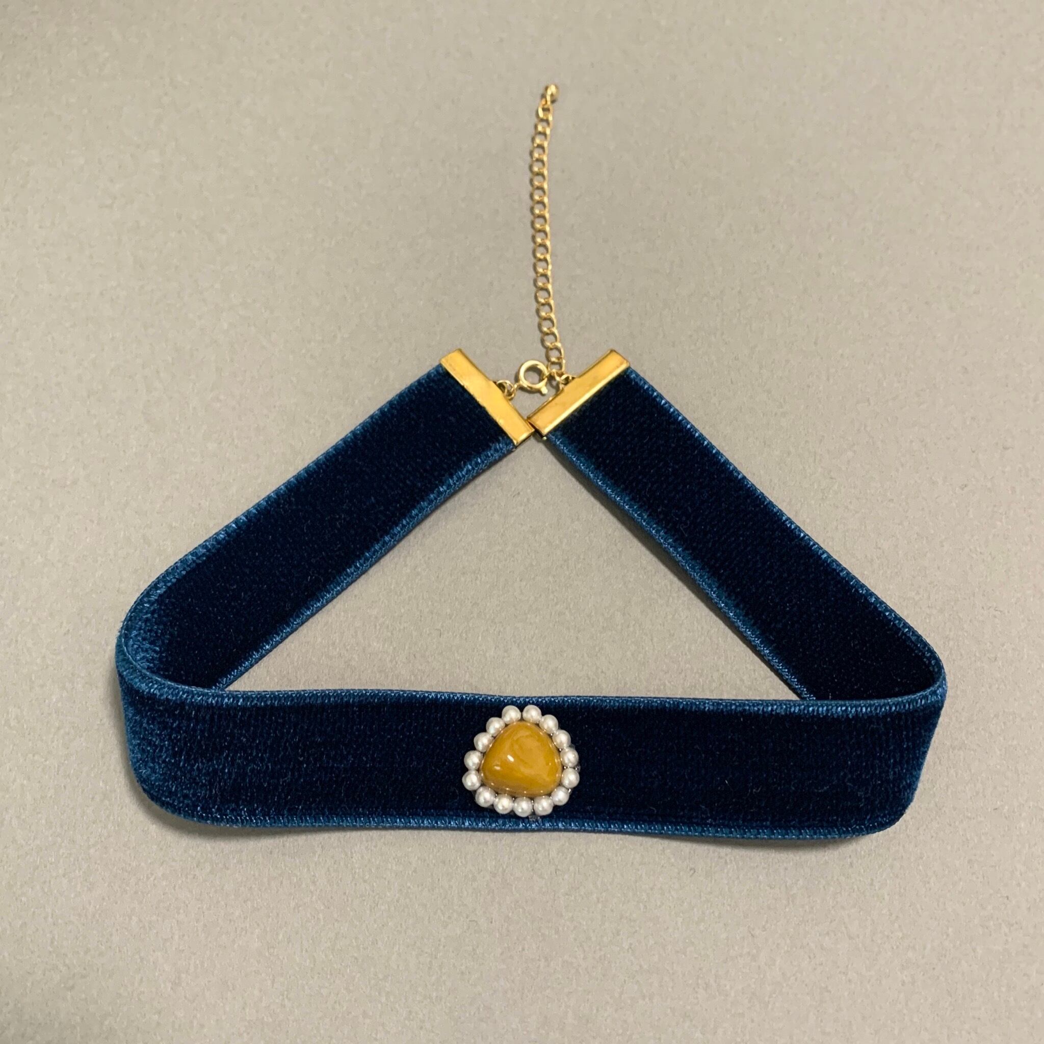 深い青のベルベットリボンに石とパールがついたチョーカーです。