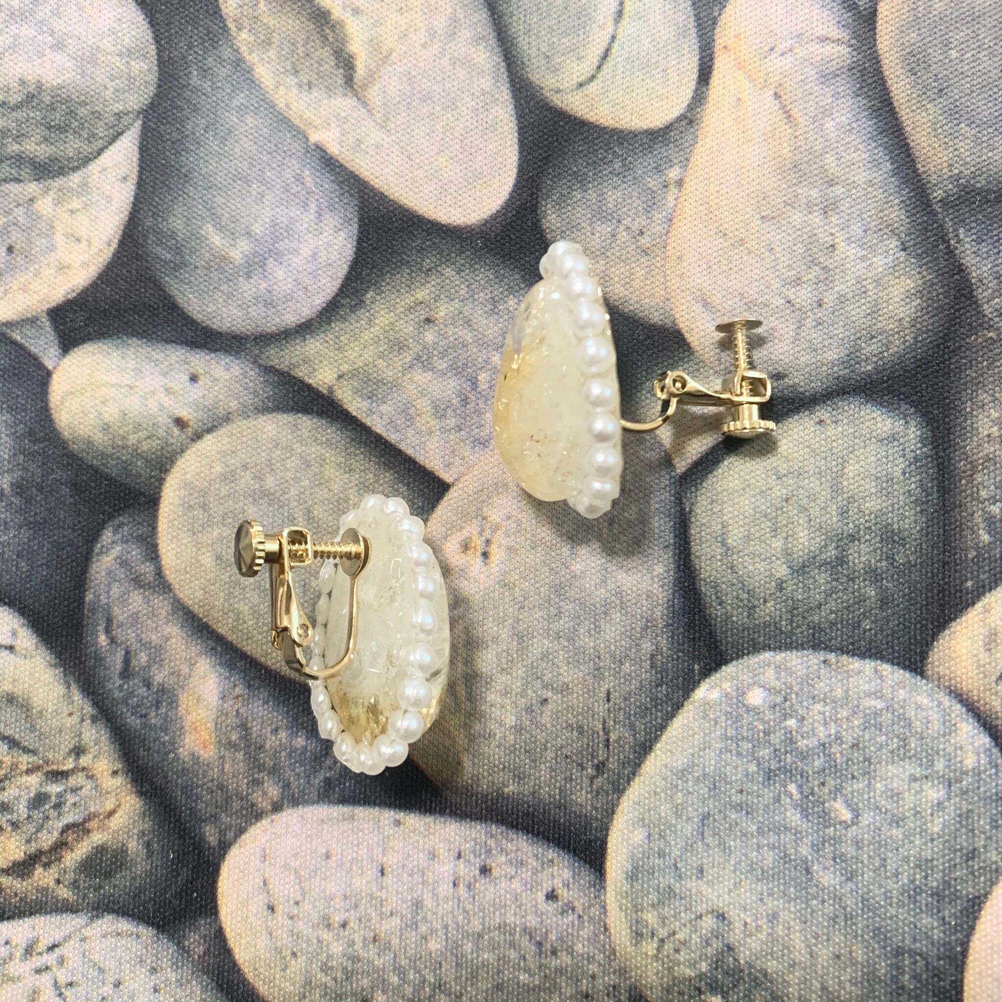 はちみつ氷みたいな石が2つ揃ったので作った幻の石のイヤリングです。パールを含めた石のサイズは縦の直径が2cmほど。