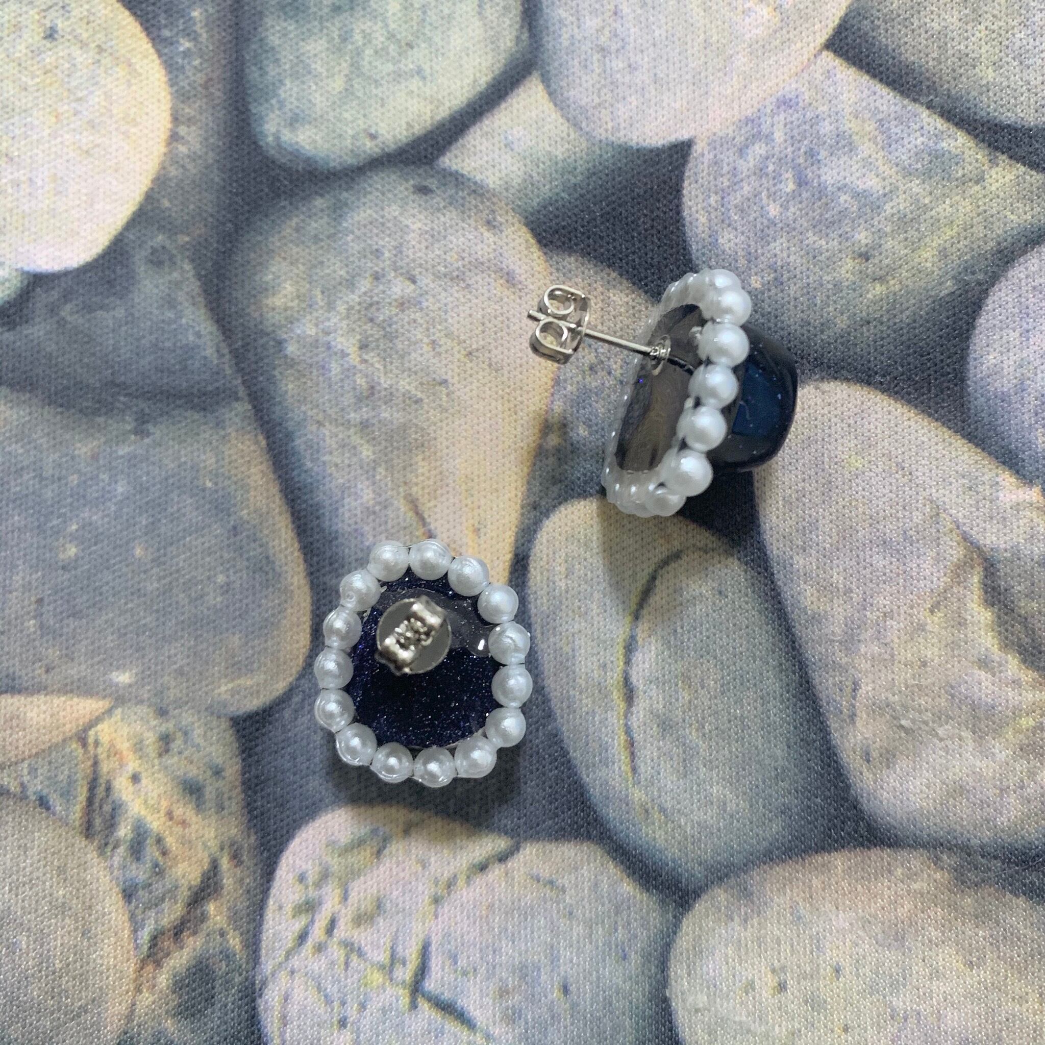 夜空みたいにキラキラした石が2つ揃ったので作った幻の石のピアスです。パールを含めた石のサイズは縦の直径が1.7cmほど。
