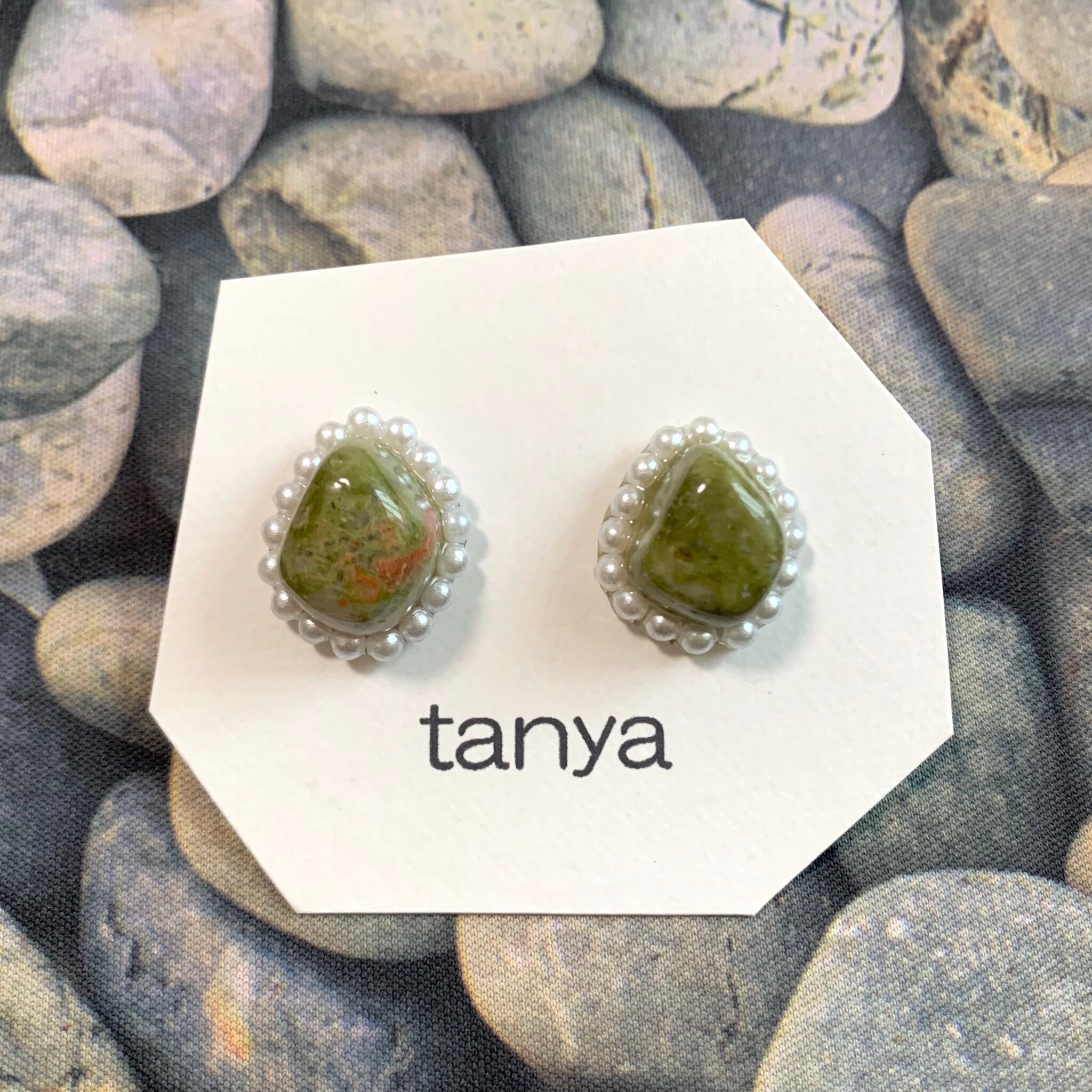 みどり色の石が2つ揃ったので作った幻の石のピアスです。パールを含めた石のサイズは縦の直径が2cmほど。