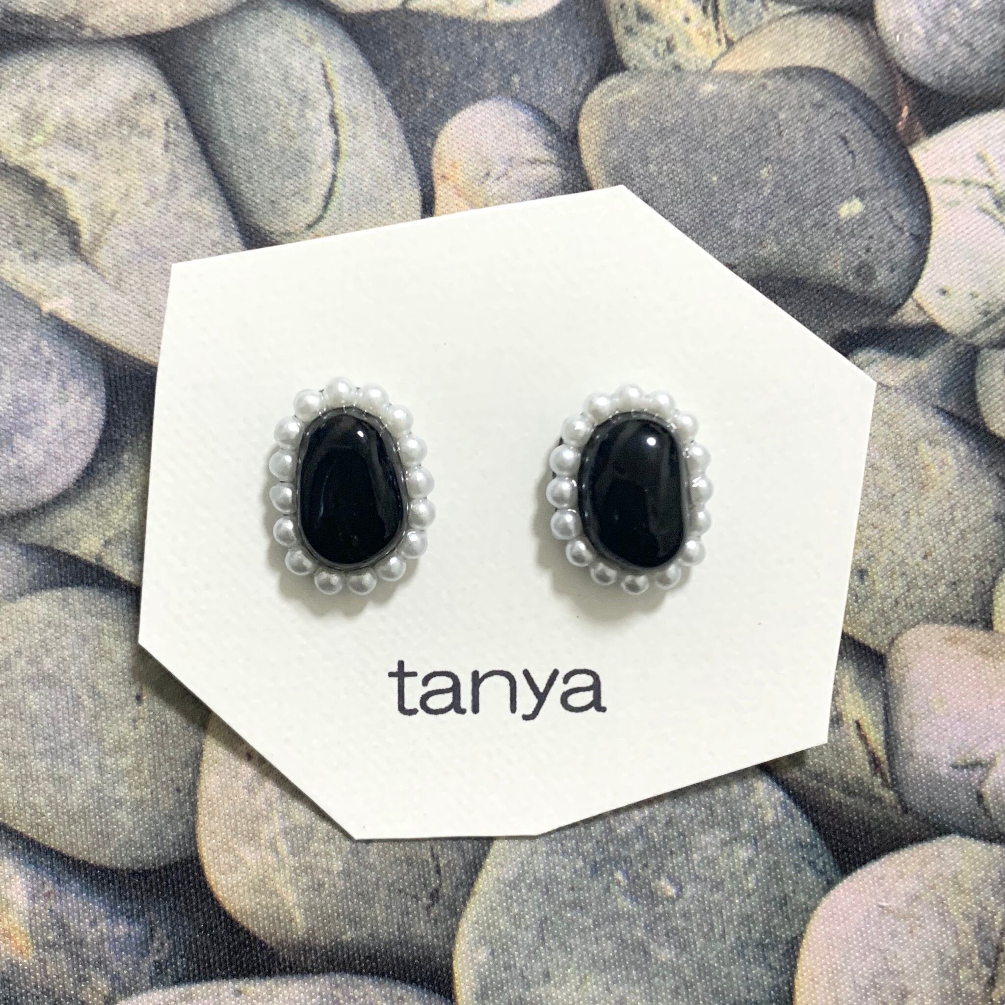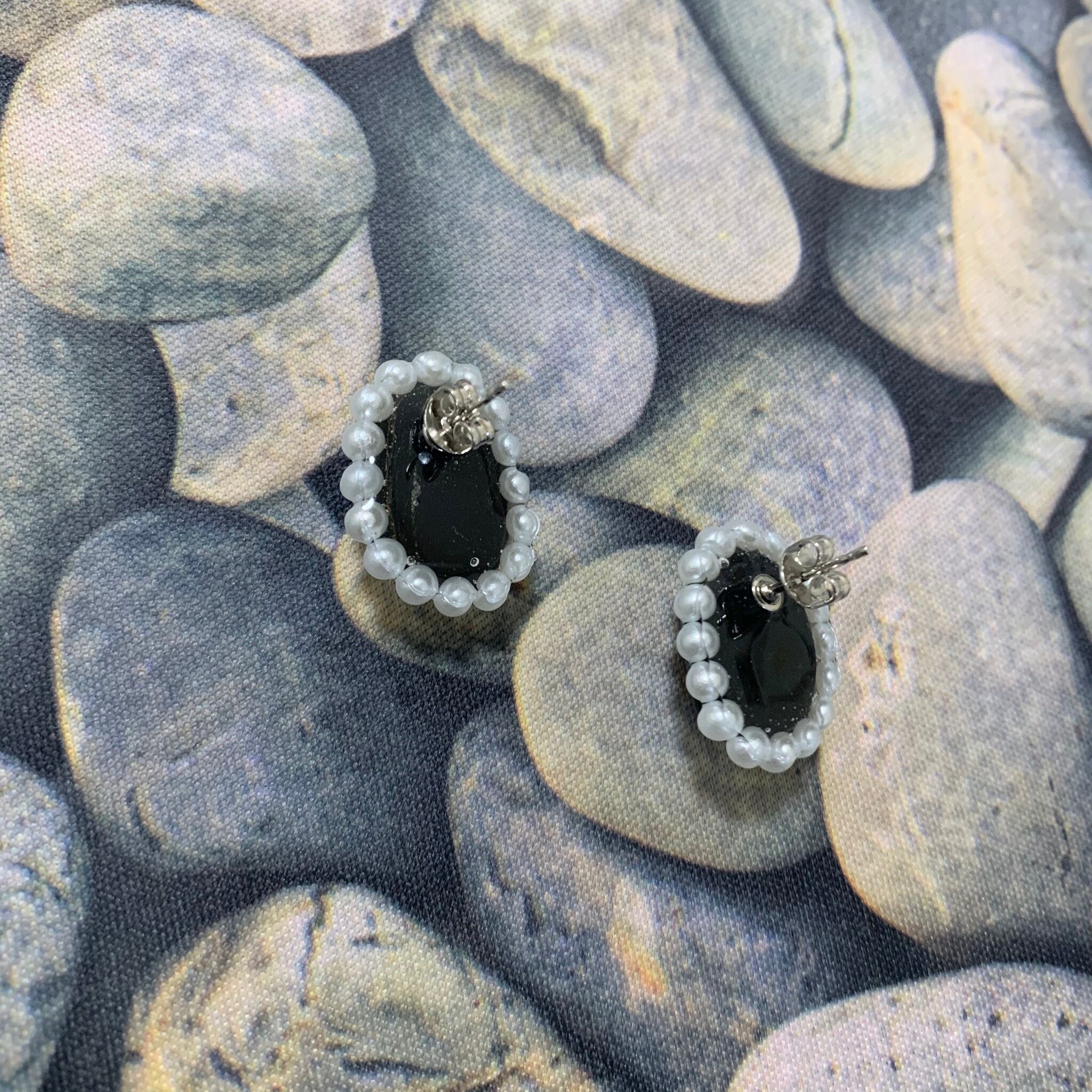 黒い石が2つ揃ったので作った幻の石のピアスです。パールを含めた石のサイズは縦の直径が2cmほど。