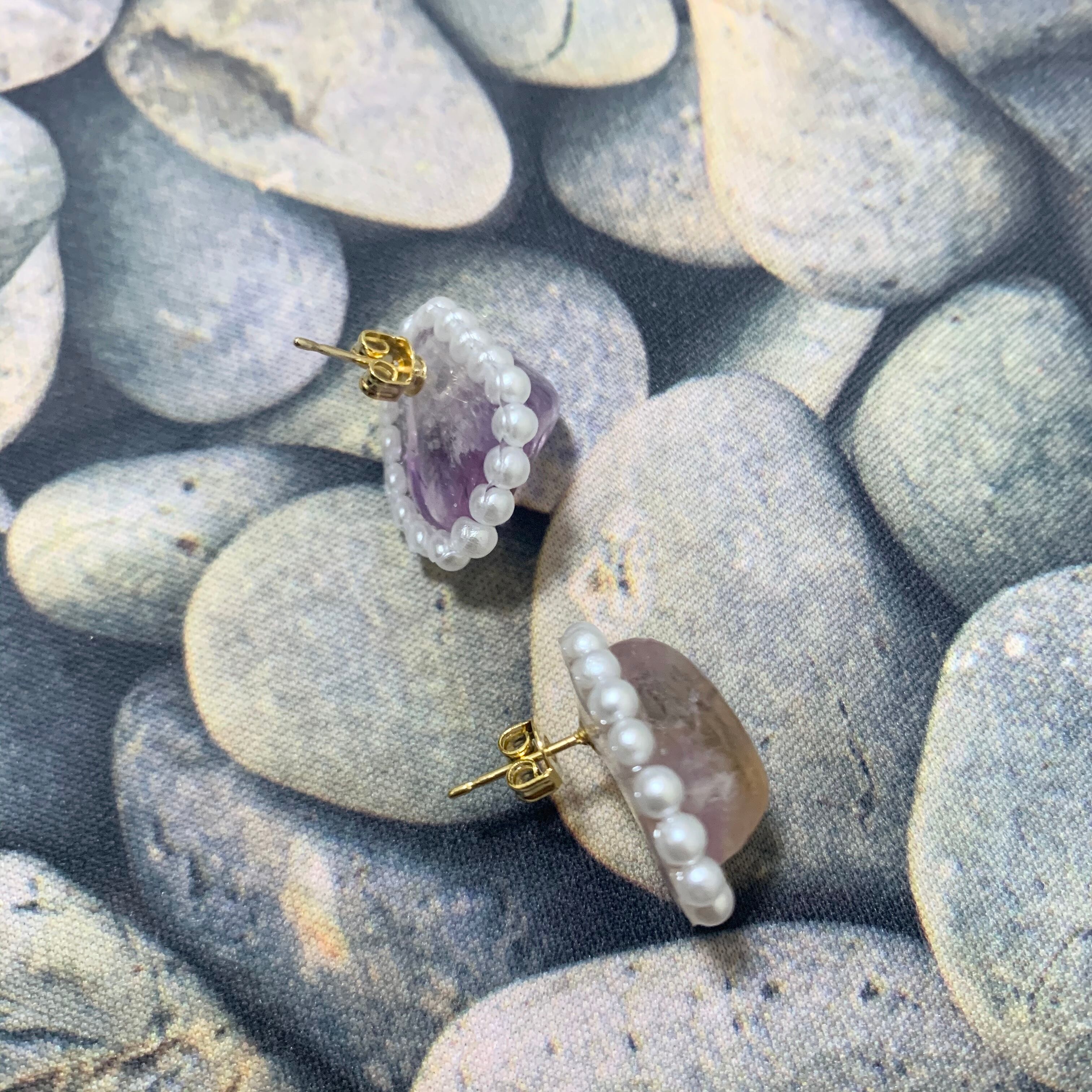 紫透明の石と片方だけほんのり黄色の入った似ている石が揃ったので作った幻の石のピアスです。パールを含めた石のサイズは縦の直径が2cmほど。