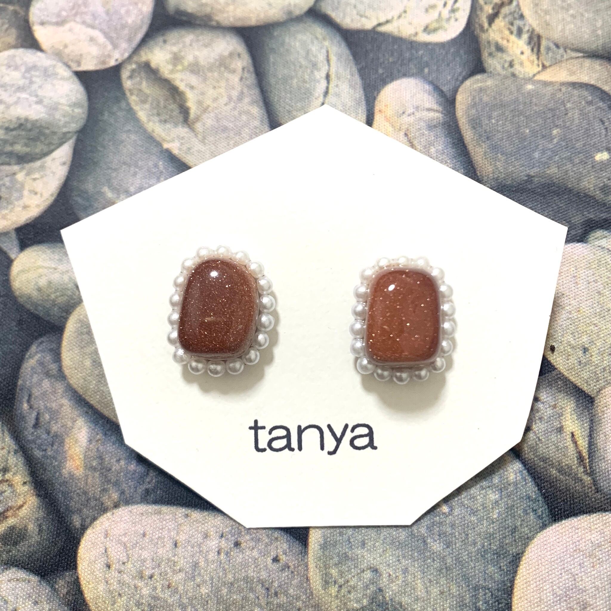 オレンジのキラキラ石が2つ揃ったので作った幻の石のイヤリングです。パールを含めた石のサイズは縦の直径は2cmほど。