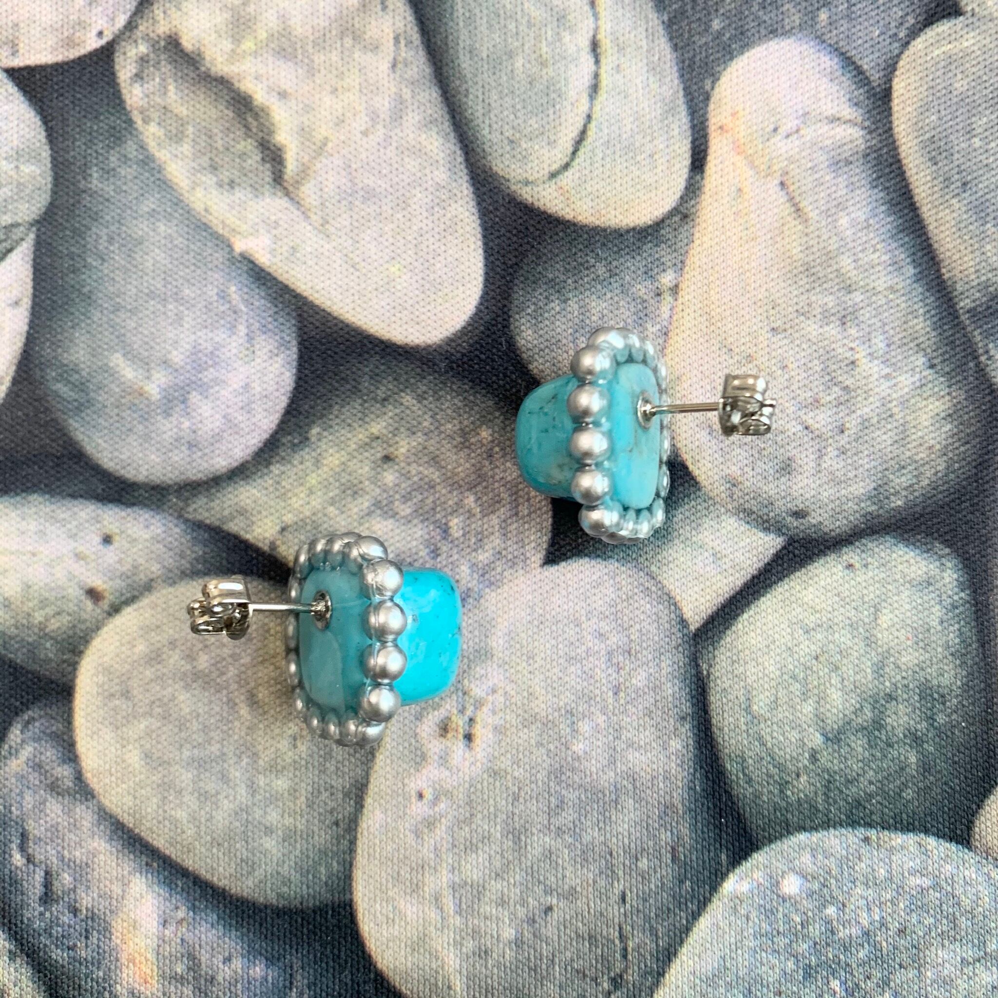 水色の石が2つ揃ったので作った幻の石のピアスです。パールを含めた石のサイズは縦の直径が1.5cmほど。