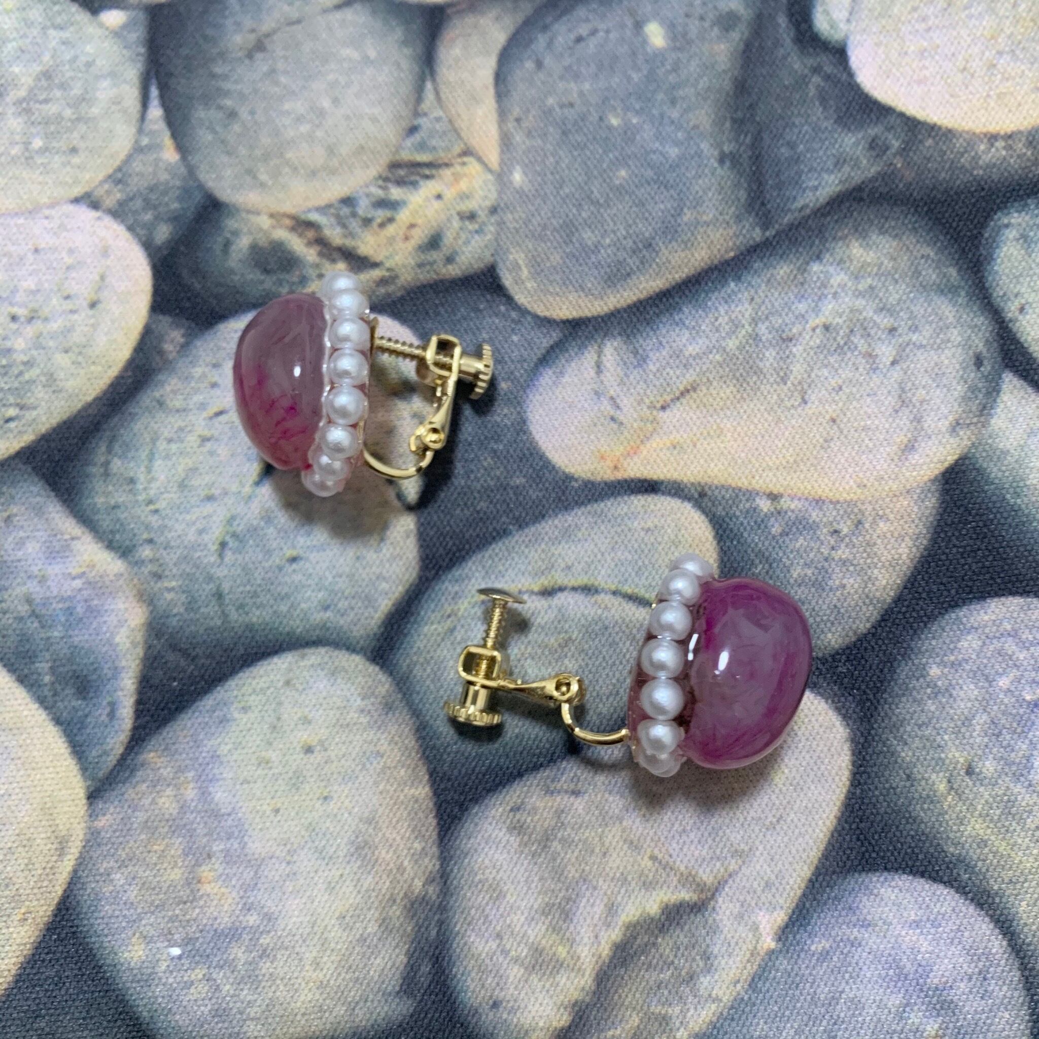 紫ピンクな石が2つ揃ったので作った幻の石のイヤリングです。パールを含めた石のサイズは縦の直径は1.8cmほど。