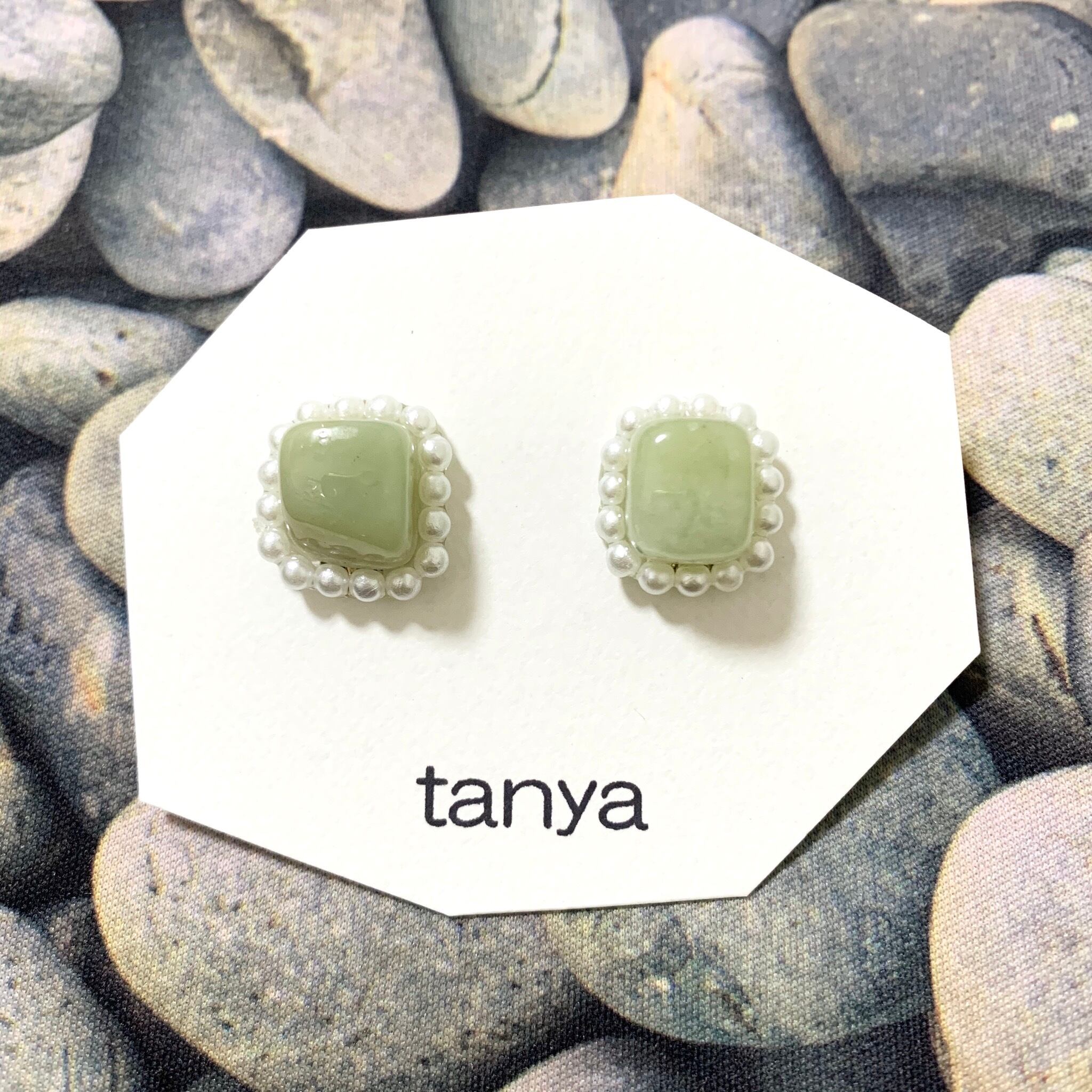 淡い黄緑の似ている石が2つ揃ったので作った幻の石のイヤリングです。パールを含めた石のサイズは縦の直径は1.6cmほど。