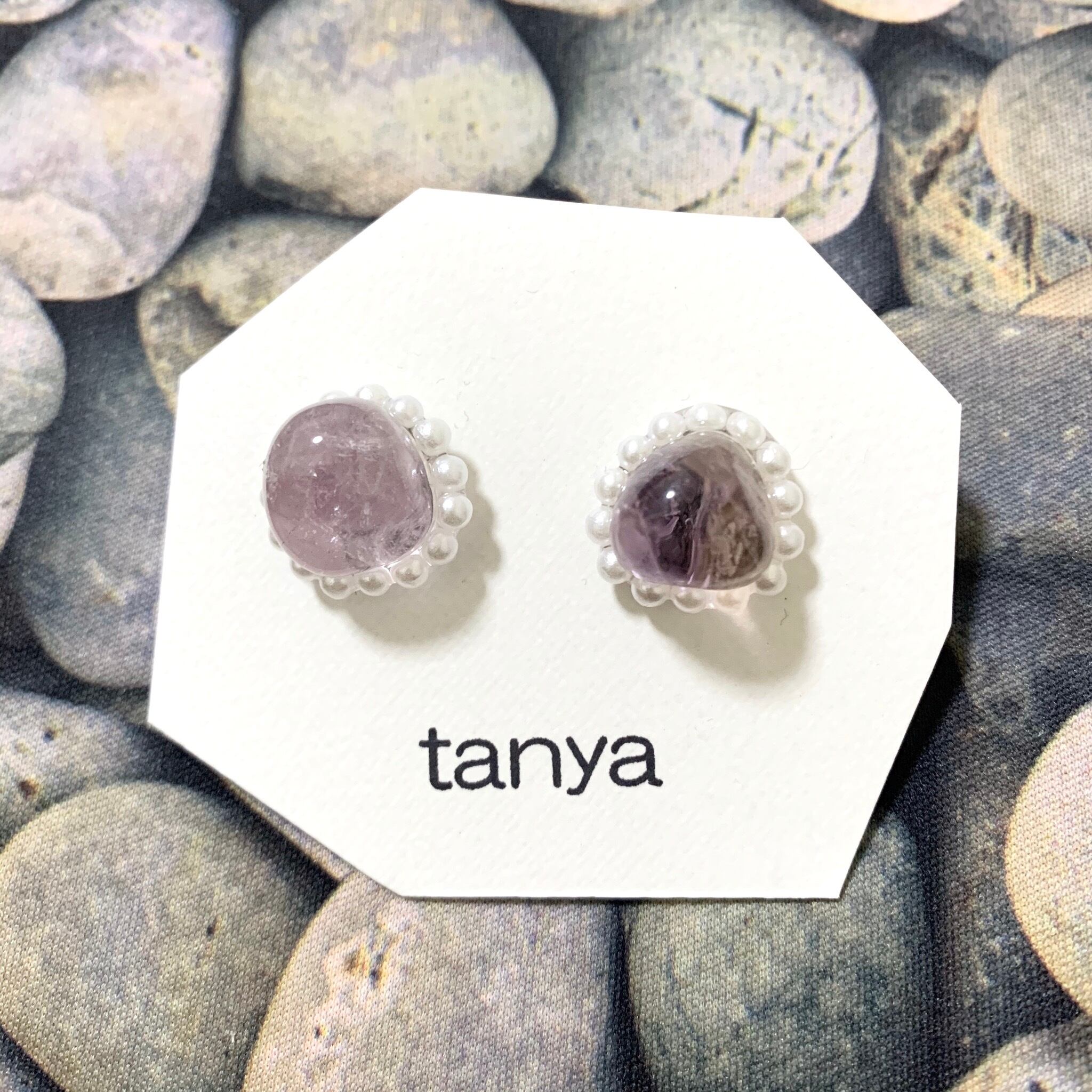 透き通った紫の似ている石が2つ揃ったので作った幻の石のイヤリングです。パールを含めた石のサイズは縦の直径は1.6cmほど。