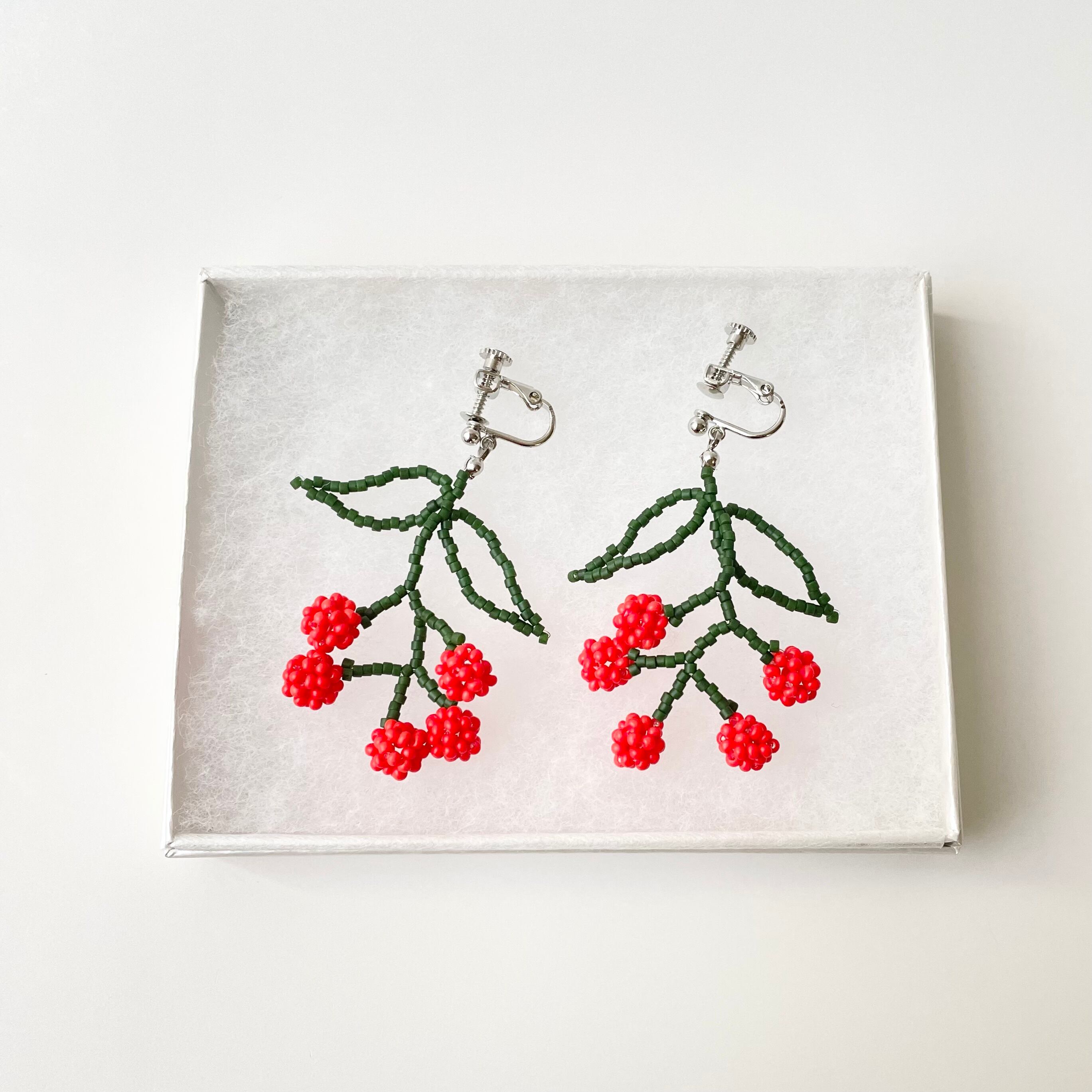 ビーズで作った木苺の耳飾り(イヤリング)です。